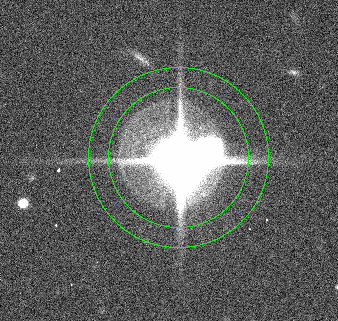 The sky was determined through an annulus with an inner radius of 70 pixels and an outer radius of 90 pixels. The figure below shows a bright star. The PSF has a bright core, and fainter, sharp-edged disk of light extending further. Depending on the star's location in the mosaic, this pupil image is generally not centred on the star. The 70 pixel inner radius insures that the disk of the pupil images does not lie in the annulus.