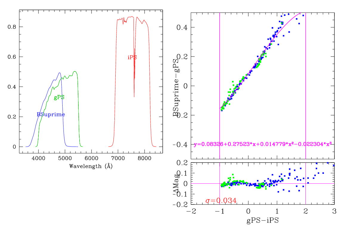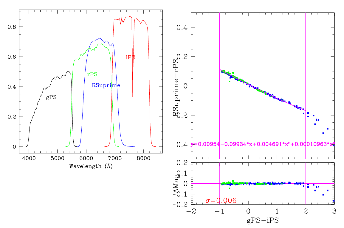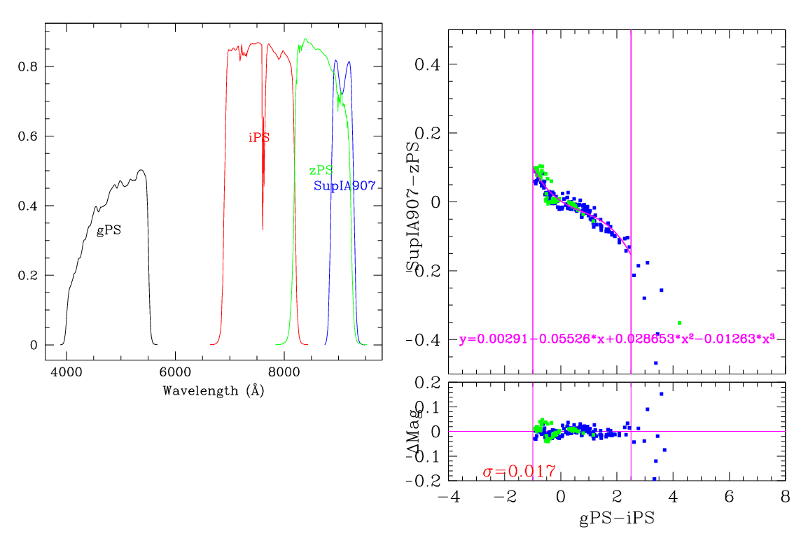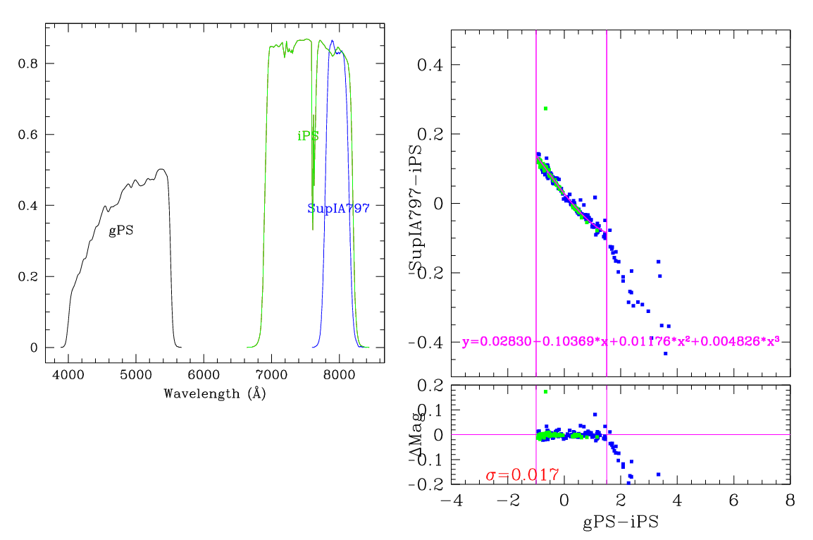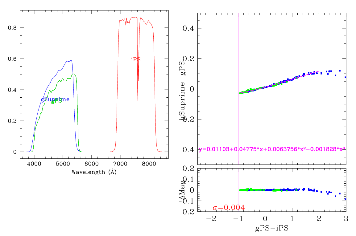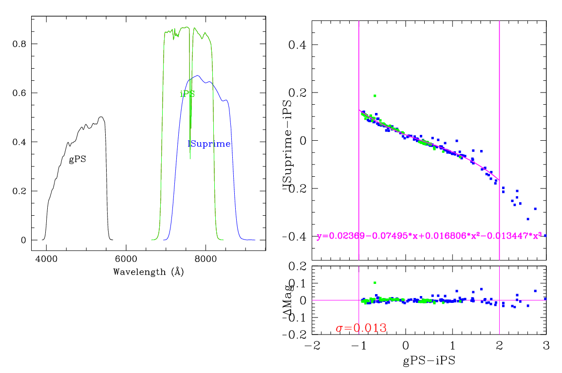 In the plots below, the left panel shows the filter curves, together with the relevant Pan-STARRS filter. The black and red curves show the Pan-STARRS g and i filters. The green curve shows the reference filter. The right panel shows the transformation itself. The green and blue dots show the Pickles and CALSPEC/a> stars. The magenta curve shows the fit, also indicated in polynomial form. The vertical lines show the colour range where this transformation is valid. </p>