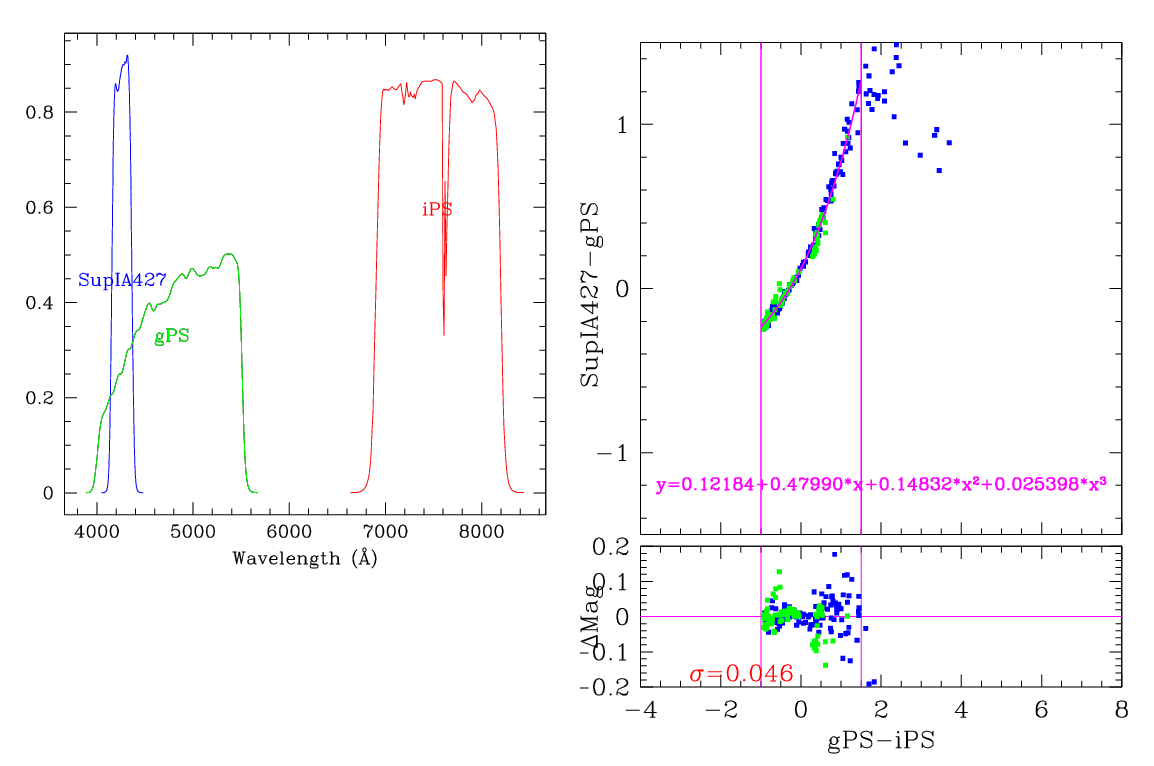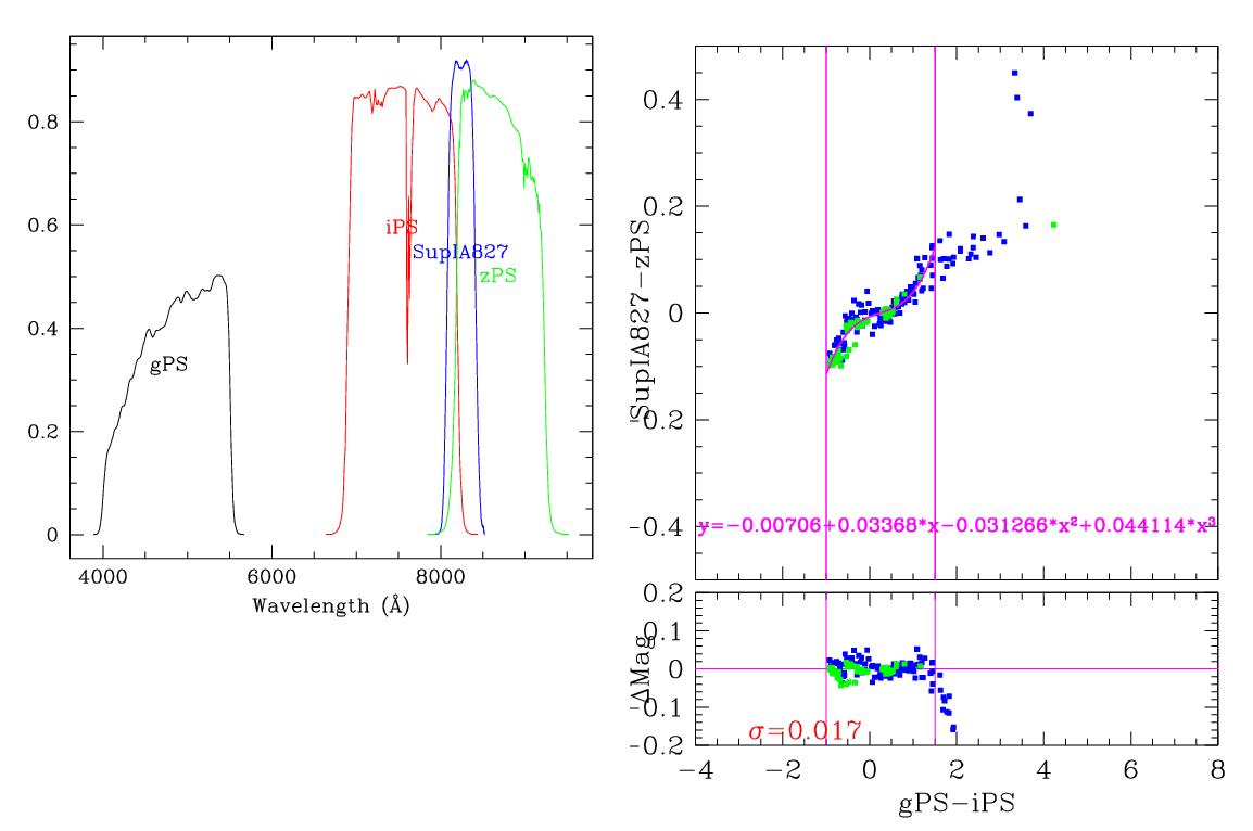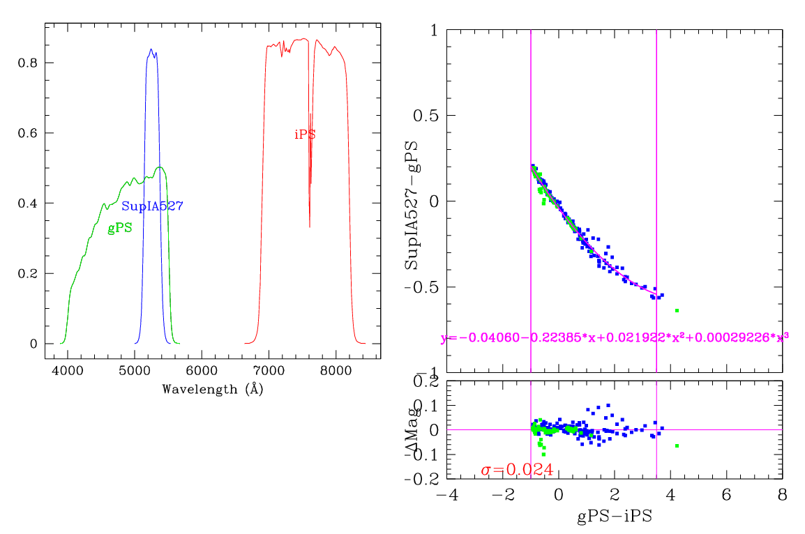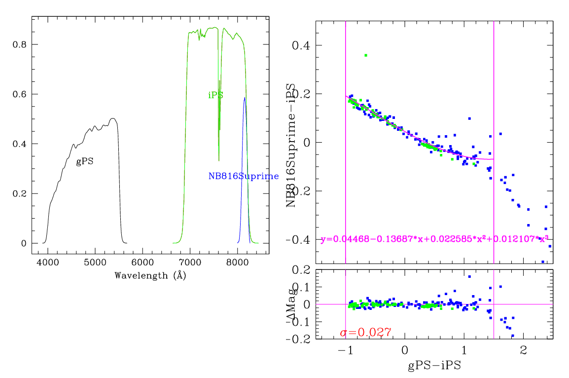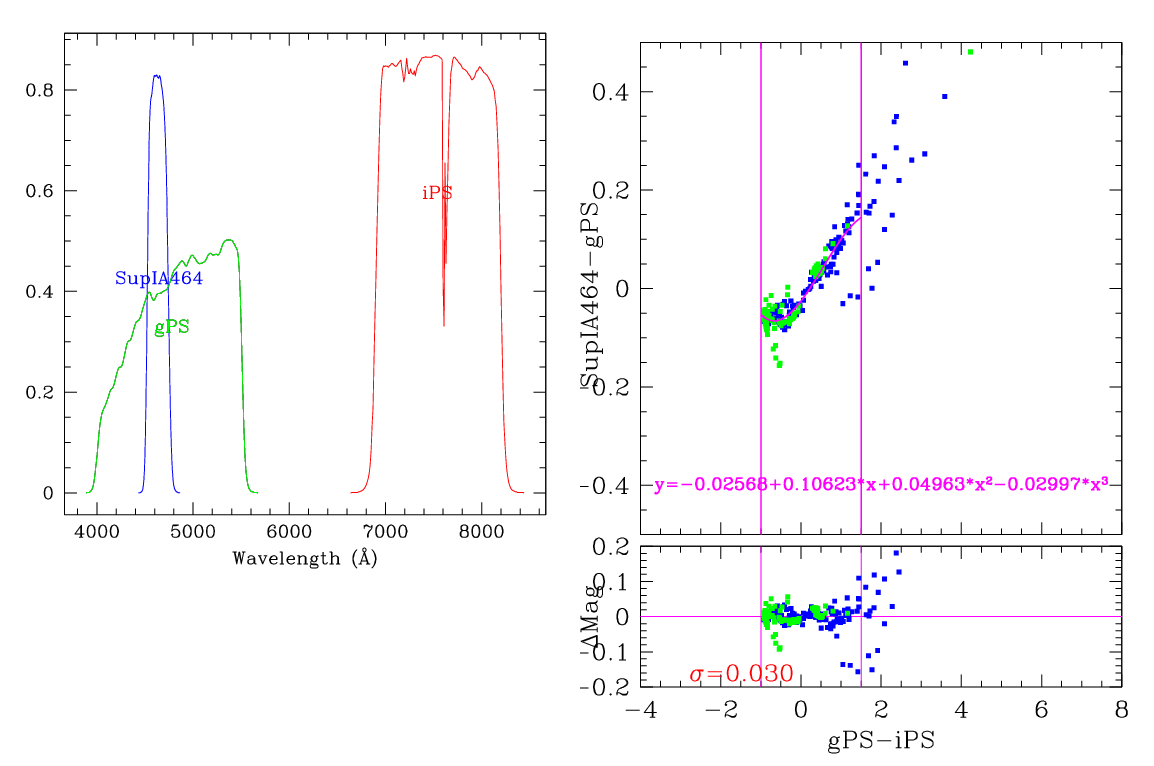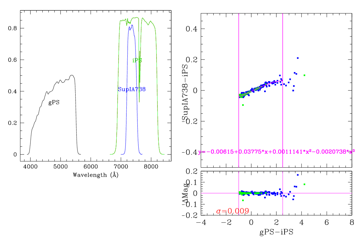 In the plots below, the left panel shows the filter curves, together with the relevant Pan-STARRS filter. The black and red curves show the Pan-STARRS g and i filters. The green curve shows the reference filter. The right panel shows the transformation itself. The green and blue dots show the Pickles and CALSPEC/a> stars. The magenta curve shows the fit, also indicated in polynomial form. The vertical lines show the colour range where this transformation is valid. </p>
