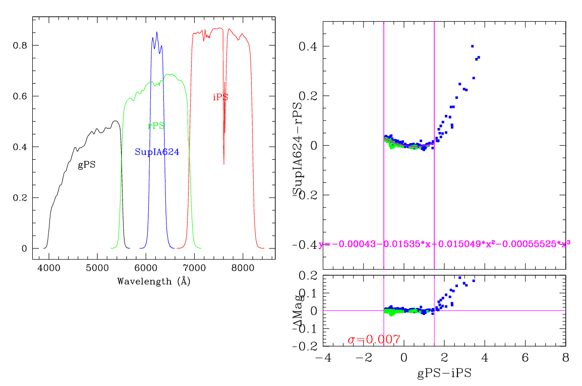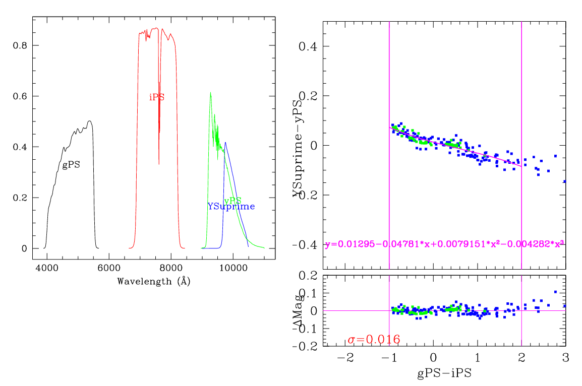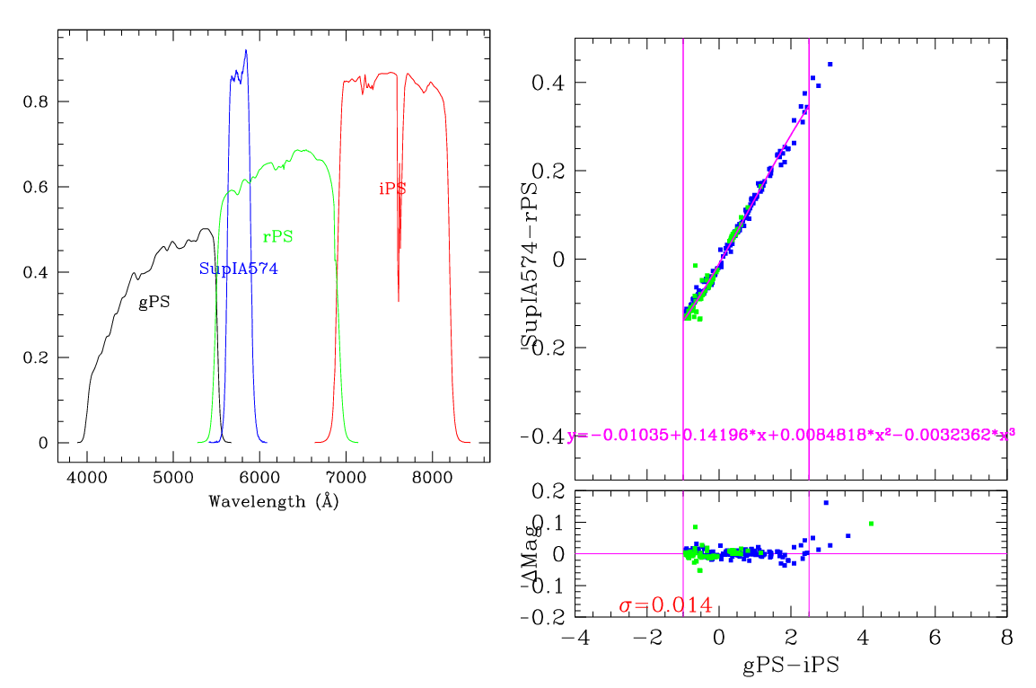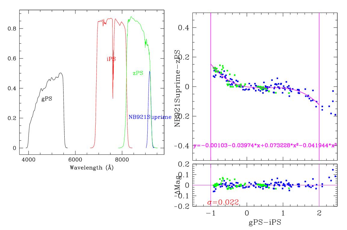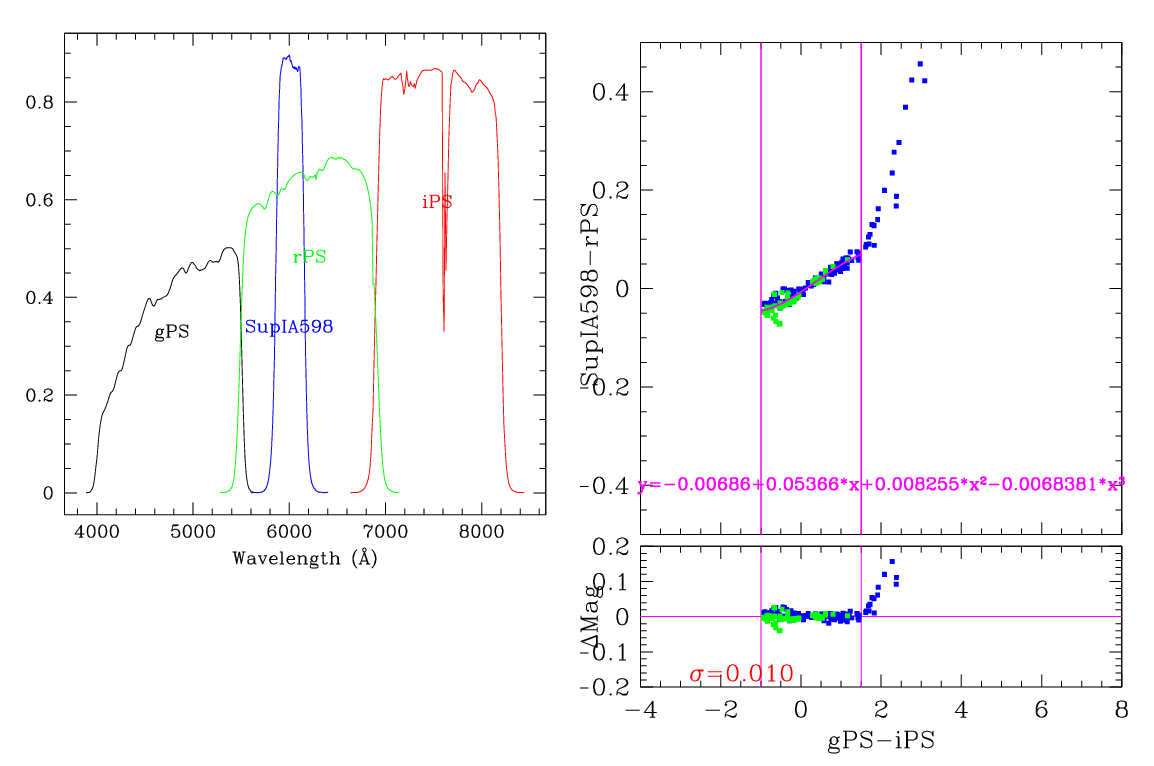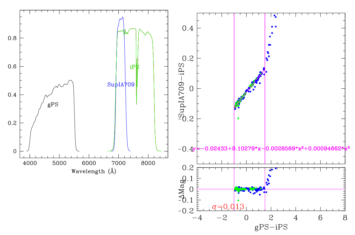 In the plots below, the left panel shows the filter curves, together with the relevant Pan-STARRS filter. The black and red curves show the Pan-STARRS g and i filters. The green curve shows the reference filter. The right panel shows the transformation itself. The green and blue dots show the Pickles and CALSPEC/a> stars. The magenta curve shows the fit, also indicated in polynomial form. The vertical lines show the colour range where this transformation is valid. </p>