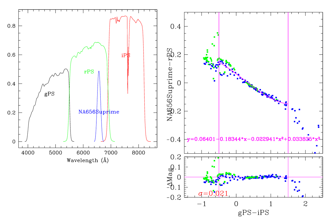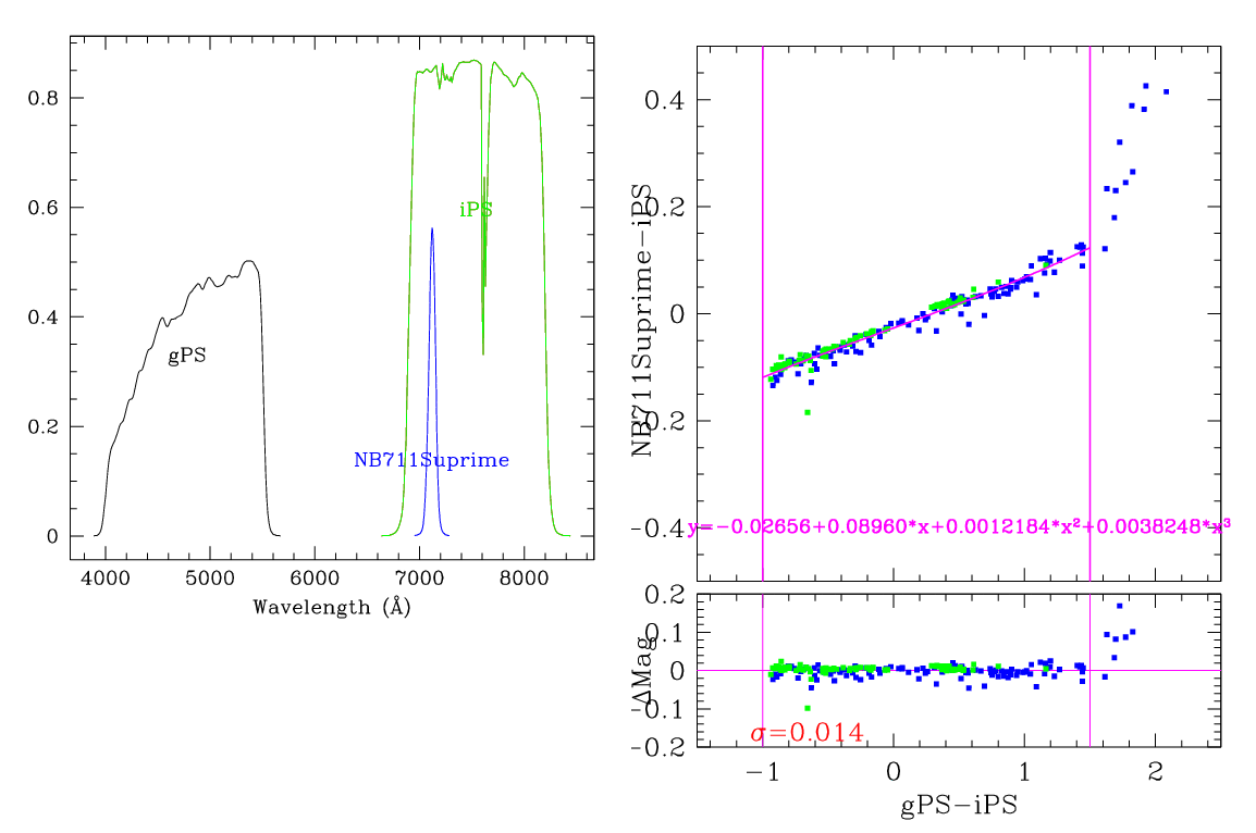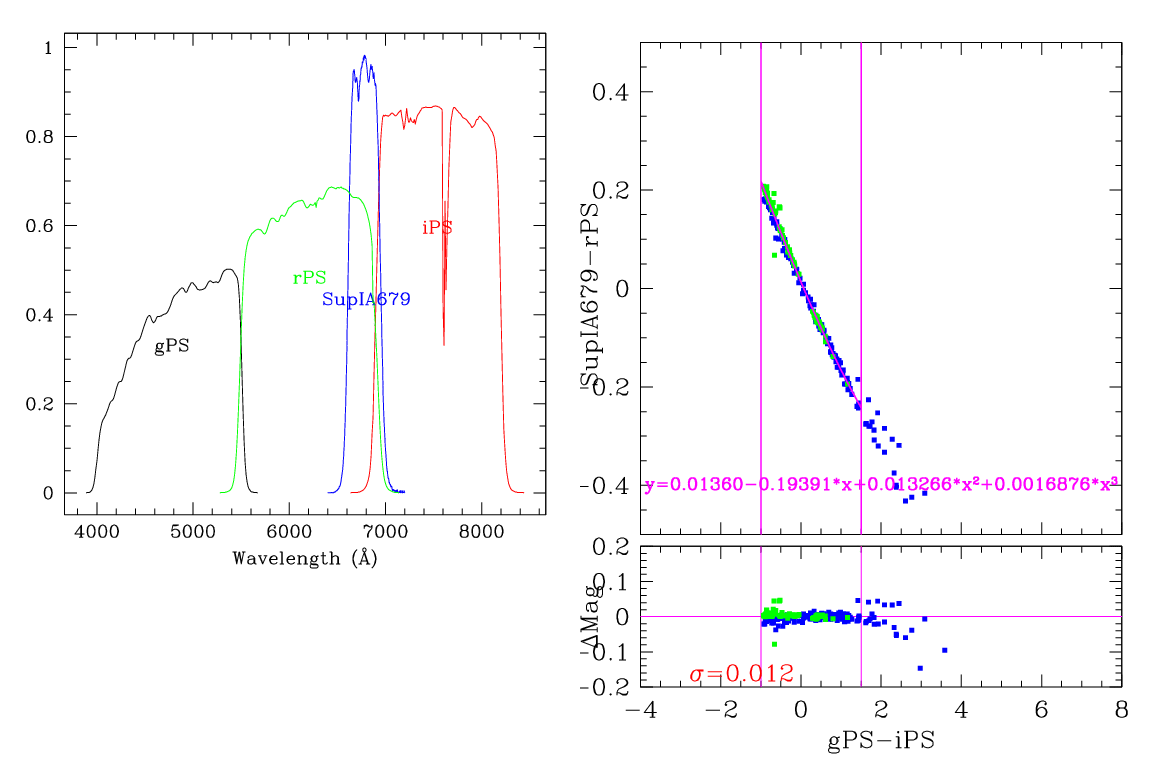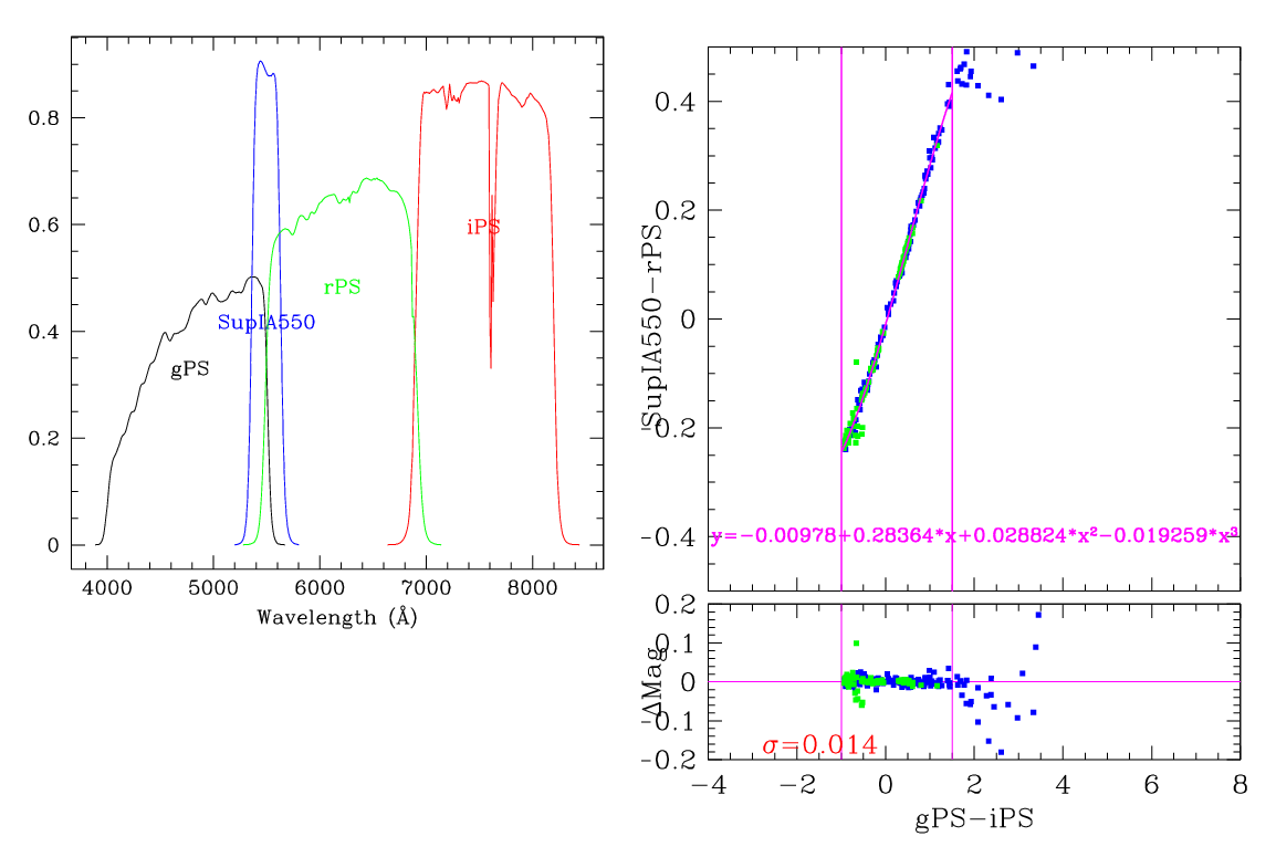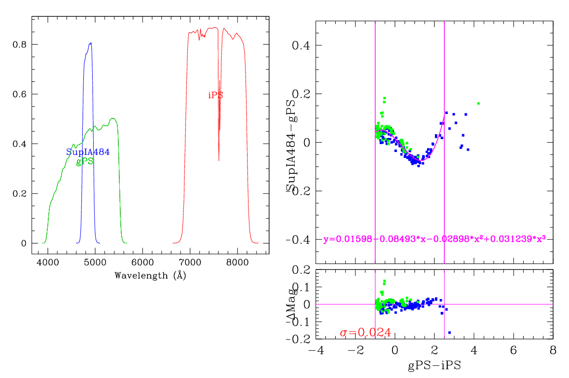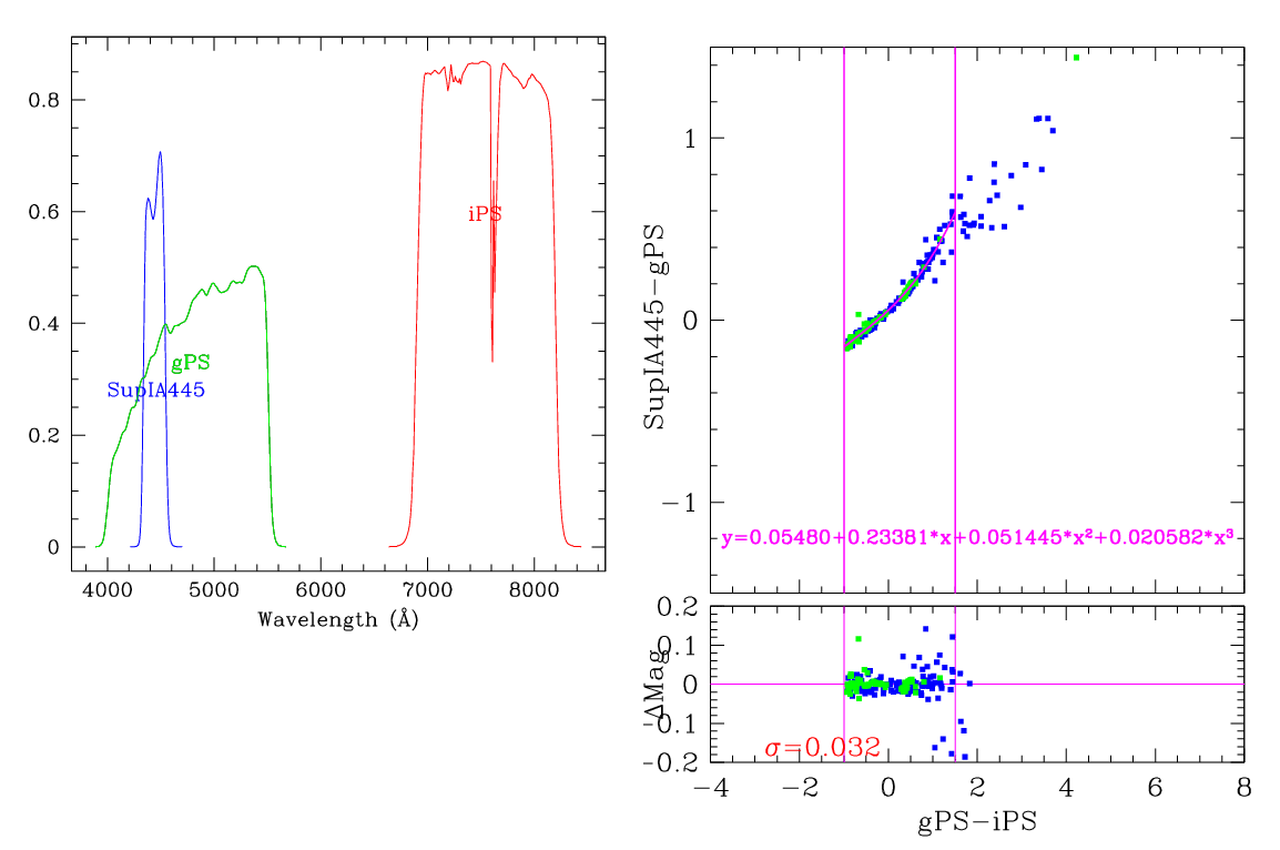 In the plots below, the left panel shows the filter curves, together with the relevant Pan-STARRS filter. The black and red curves show the Pan-STARRS g and i filters. The green curve shows the reference filter. The right panel shows the transformation itself. The green and blue dots show the Pickles and CALSPEC/a> stars. The magenta curve shows the fit, also indicated in polynomial form. The vertical lines show the colour range where this transformation is valid. </p>